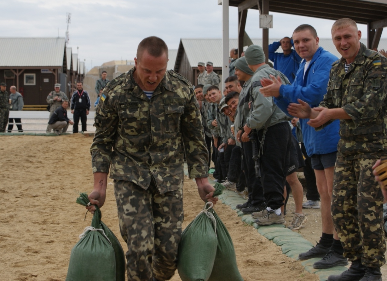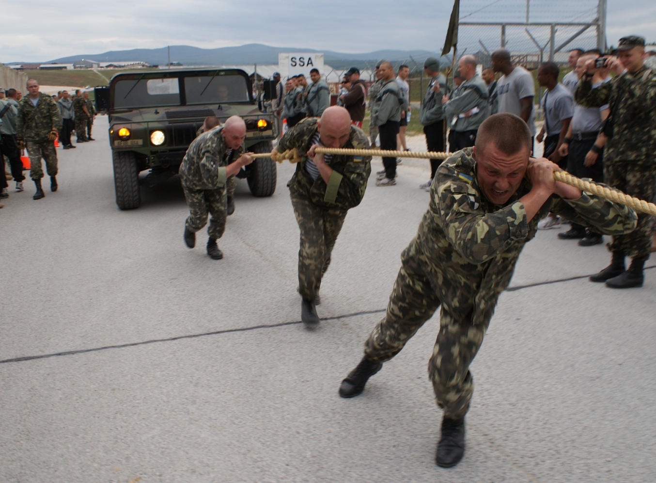 По условиям соревнований (которые, кстати, похожи на украинские «богатырские игры») миротворцы выявляли лучших в перемещении колеса, переноске мешков с песком, буксовании автомобиля Хаммер и перетягивании каната.